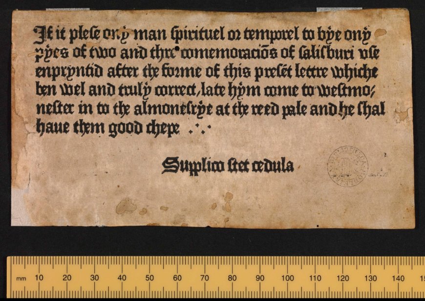 ലണ്ടനിലെ വെസ്റ്റ്മിൻസ്റ്റർ ആബിയിലുള്ള തന്റെ ഷോപ്പിന് മുന്നിൽ പ്രദർശിപ്പിക്കാനാണ് കാക്സ്റ്റൺ ഈ ലഘുലേഖ തയ്യാറാക്കിയത്. "സാരം പൈ" (Sarum Pie) എന്നറിയപ്പെടുന്ന വൈദികരുടെ പ്രാർത്ഥനാപുസ്തകത്തിന്റെ വിപണനമായിരുന്നു ഇതിന്റെ ലക്ഷ്യം. "ആത്മീയമോ ലൗകികമോ ആയ ആവശ്യങ്ങൾക്കായി ഈ പുസ്തകം ആഗ്രഹിക്കുന്നവർക്ക് ഇത് കുറഞ്ഞ വിലയ്ക്ക് ലഭ്യമാകും" എന്ന വാഗ്ദാനത്തോടെ ഉപഭോക്താക്കളെ ആകർഷിച്ച ഈ ഏഴുവരി കുറിപ്പാണ് ആധുനിക പരസ്യവിദ്യയുടെ അടിസ്ഥാനമായി മാറിയത്. അക്കാലത്തെ ഈ ചെറിയ കടലാസ് തുണ്ട് ആധുനിക കാലത്തെ അതിബൃഹത്തായ പരസ്യ വ്യവസായത്തിന്റെ വിത്തായിരുന്നു.