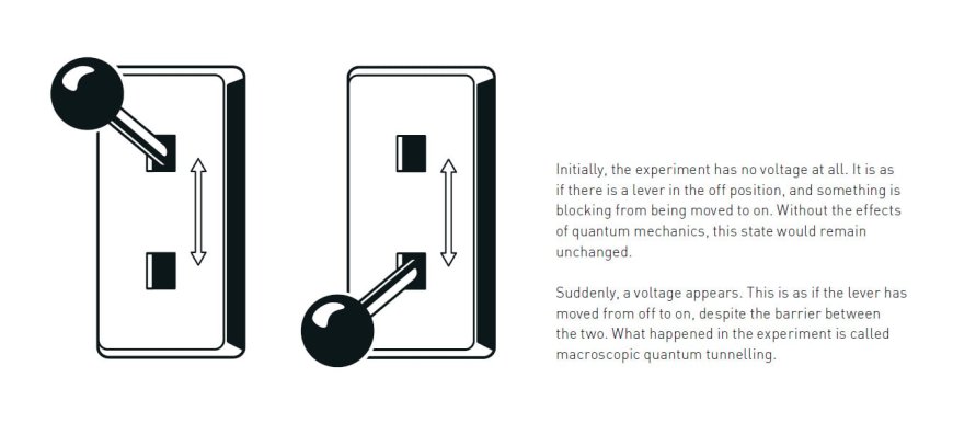 ഉദാഹരണം: സൂര്യൻ്റെ ഉള്ളിൽ, കണികകൾ ടണലിങ് വഴി ഒന്നിക്കുന്നു, അതാണ് സൂര്യനെ തിളങ്ങാൻ സഹായിക്കുന്നത്. സാധാരണ ടണലിങ് ചെറിയ കണികകൾക്ക് മാത്രമാണ് . പക്ഷേ, ഒരു വലിയ ചിപ്പിൽ (1 സെന്റിമീറ്റർ) ടണലിങ് സാധ്യമാണെന്ന് ഈ മൂന്നുപേർ തെളിയിച്ചു . അവർ ഒരു "സൂപ്പർകണ്ടക്ടർ" ഉപയോഗിച്ചു – അതിൽ ബില്യൺ കണികകൾ ഒരുമിച്ച് "നൃത്തം" ചെയ്യുന്നു, ഒരു വലിയ കണികയെപ്പോലെ. ഒരു ഗ്രൂപ്പ് ഡാൻസ് പോലെ, എല്ലാവരും ഒരുമിച്ച് ചലിക്കുന്നു!